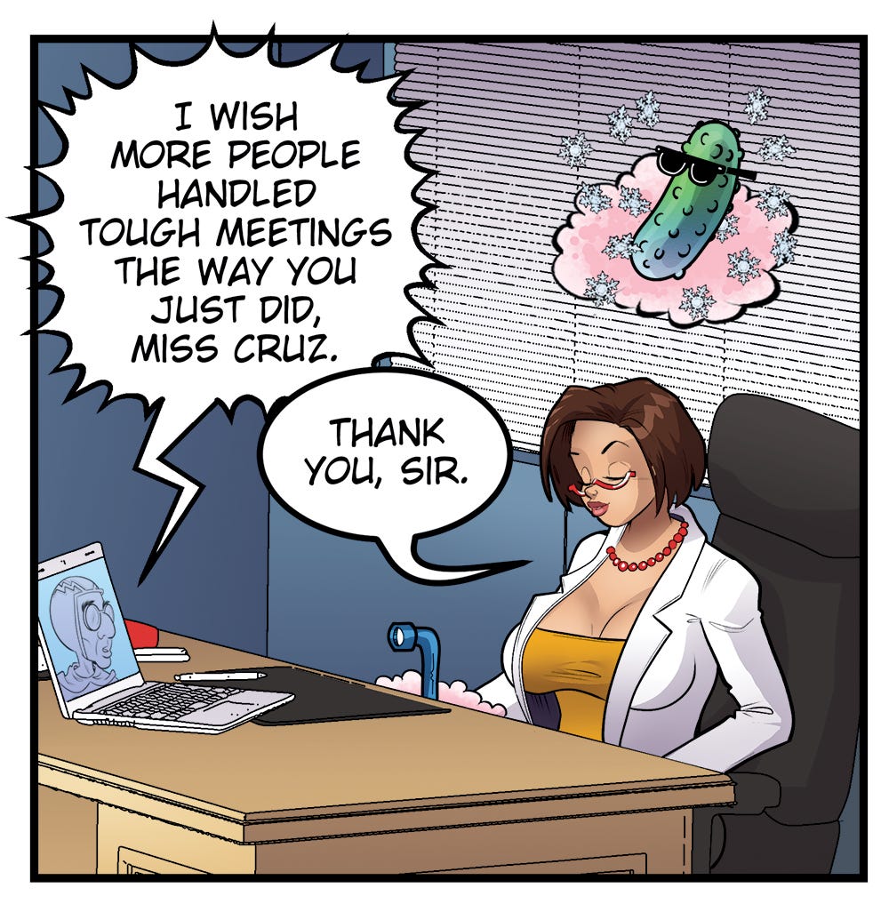 Dr. Whoosh (on laptop): “I wish more people handled tough meetings the way you just did, Miss Cruz.”