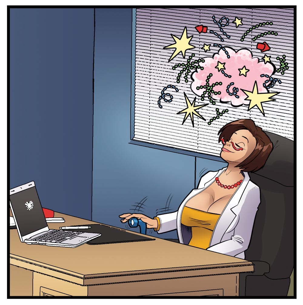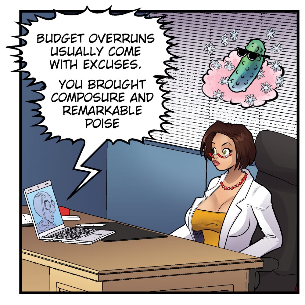 Dr. Whoosh (on laptop, to Cassie Cruz, who is in her office): “Budget overruns usually come with excuses. You brought composure and remarkable poise.”