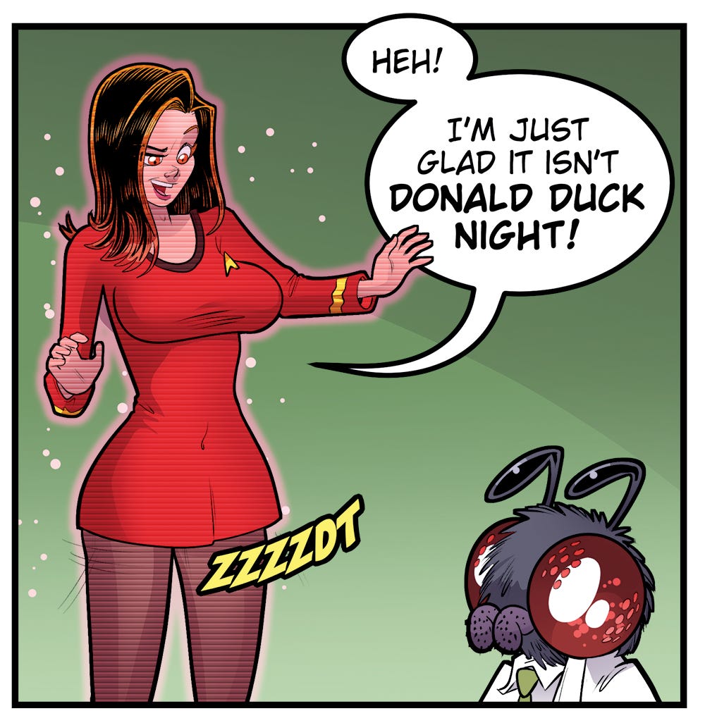Holo-Clone Miss Match (now zapped into a “Star Trek: The Original Series” micro-miniskirt): Heh! I’m just glad it wasn’t Donald Duck Night!