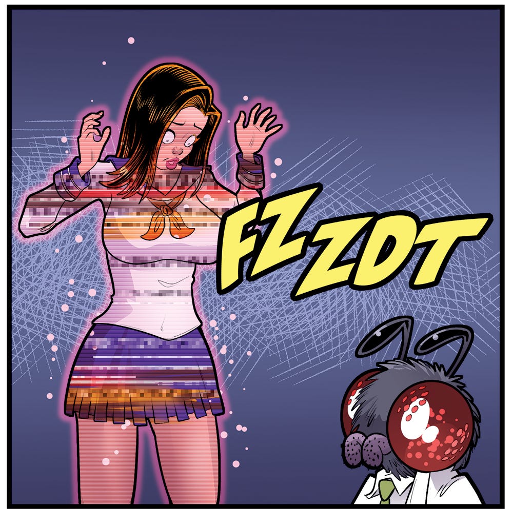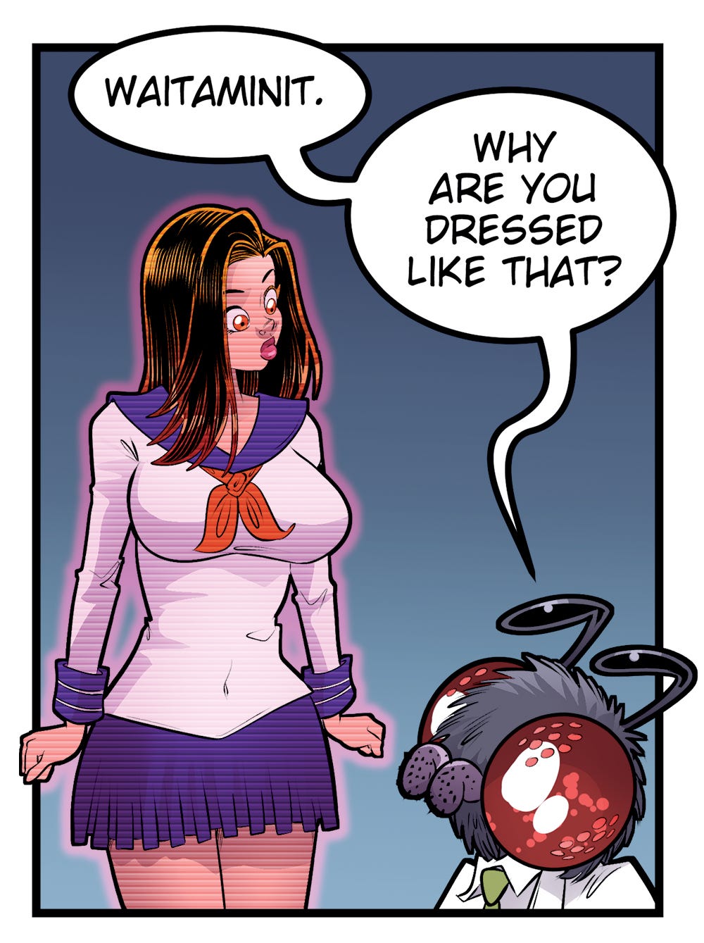 Today’s page takes us back into Dr. Muskiday’s laboratory, where our favorite mad scientist triumphantly unveils his new invention. It’s the kind of breakthrough that clearly puts him on track to dominate Evil Inc’s upcoming Mad Science Fair. But before we can find out what it is, he has to find out why this holo-clone girlfriend — who was built to match his every whim — is dressed like an extra in an anime!