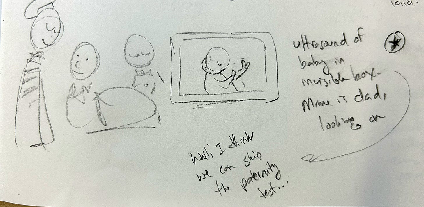 It’s a scene in which a pregnant woman is getting an ultrasound. Her partner, a mime, stands proudly by. In the monitor, the baby is pushing against a series of invisible walls (maybe even looking as if it’s pushing against the “inside” of the monitor). The ultrasound technician makes a comment about skipping the paternity test.