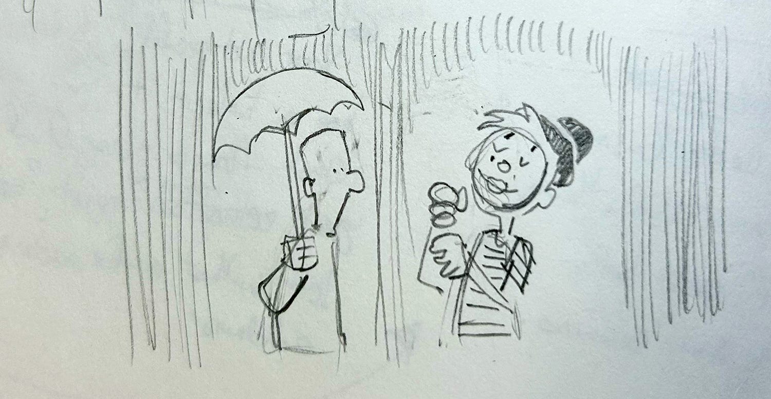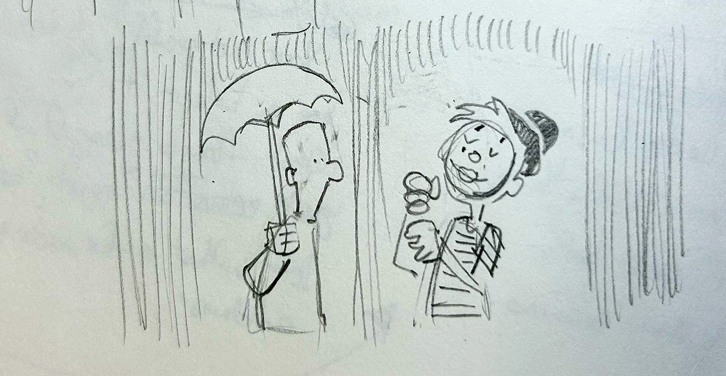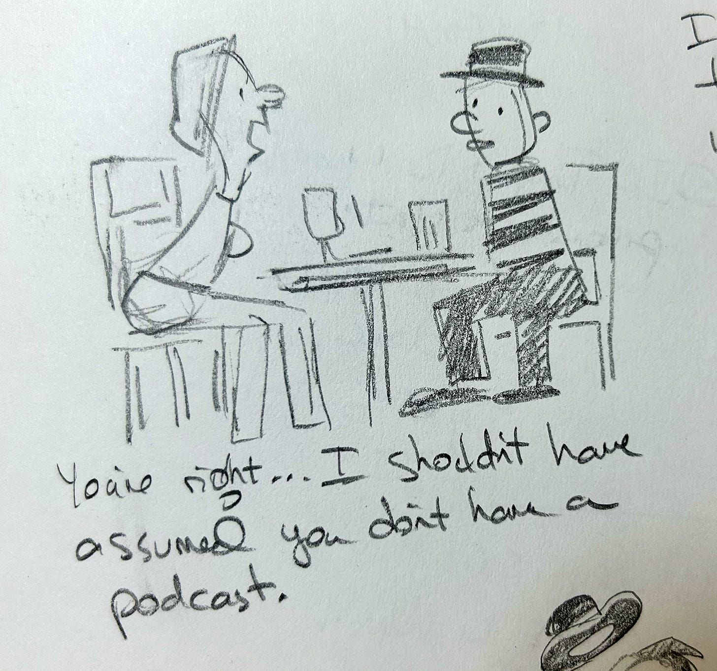 I like the “podcast” joke, but it’s really difficult to land a double-negative punchline. And I have no doubt the rainy-day gag has been done a dozen times. I love this next idea, but I think it’s better suited for animation…