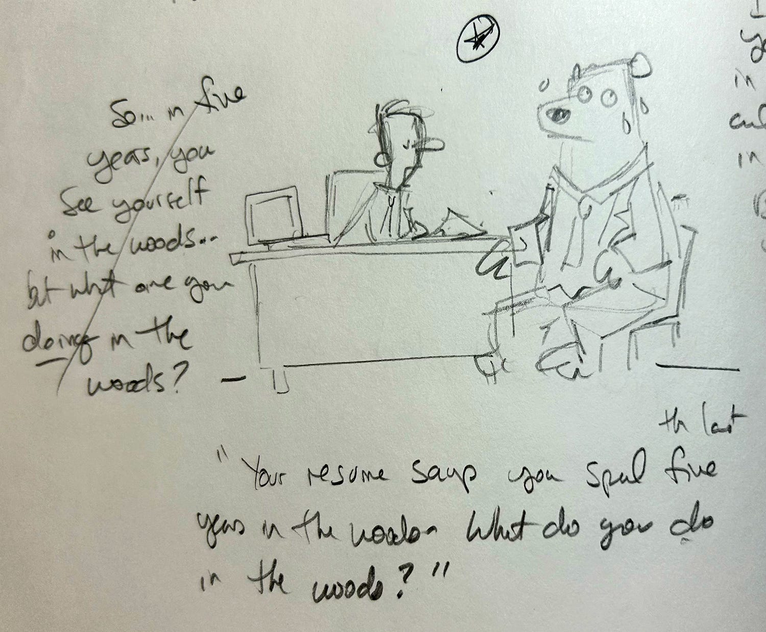 OK. I like this one. It’s a bear in a job interview. The interviewer says: “Your resume says you spent the last five years in the woods, but what did you do in the woods?”
