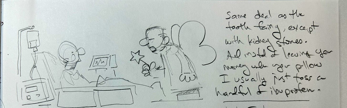 The burly faerie on the right says, “…Same deal as the tooth faerie, except with kidney stones. And instead of leaving money under your pillow, I usually just toss a handful of ibuprofen.”