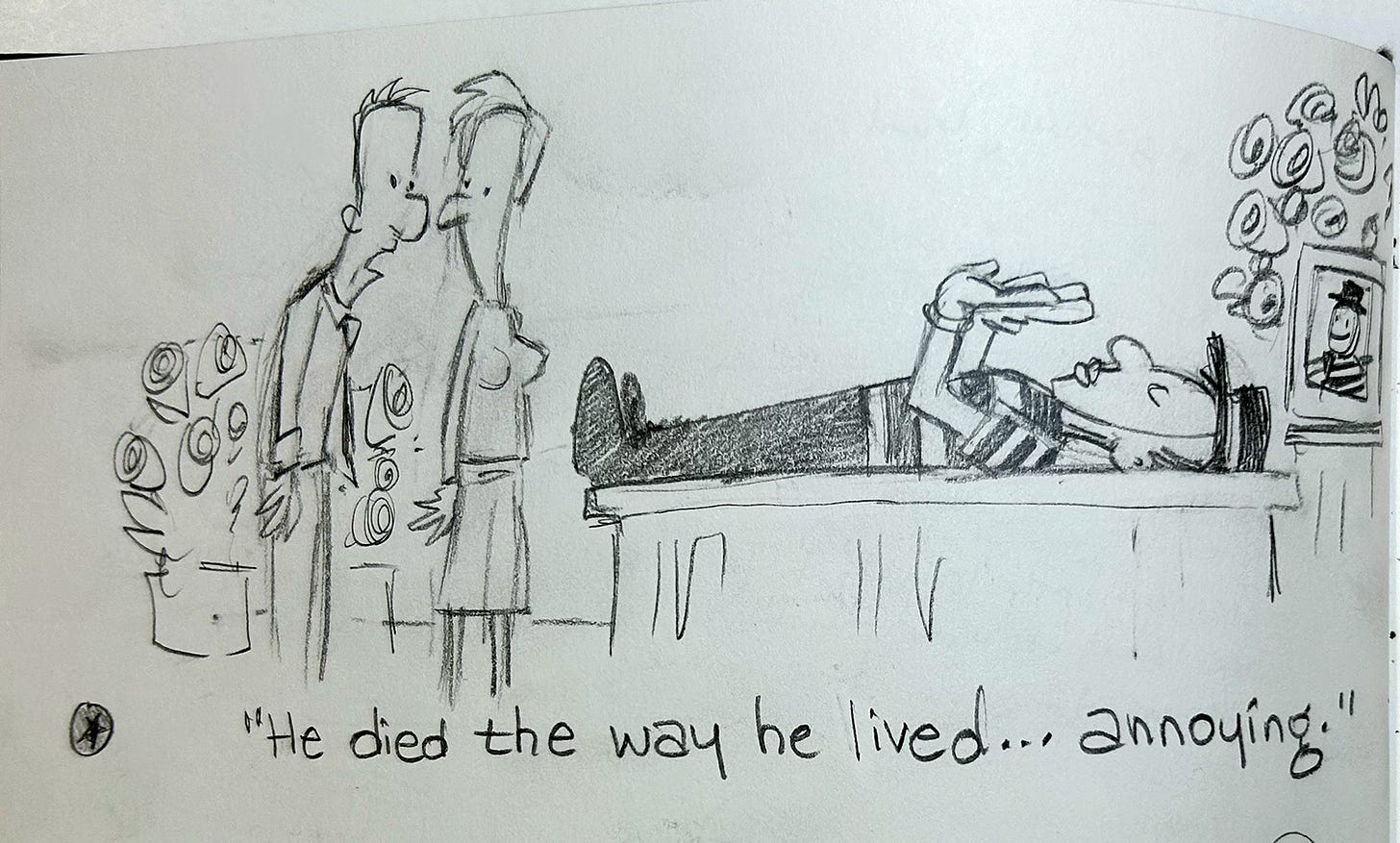 I don’t often let people look inside my sketchbook. Part of the reason is that it’s mostly words and, therefore, not too exciting unless you can read my scrawl. The other part is a very natural resistance towards sharing unfinished work. But at the risk of oversharing, here’s a look at a few images from the last several weeks. They’re all brainstorming sessions for the single-panel cartoons I share on Patreon on Mondays. Some of them, like the first, have already been turned into comics. Some of them eventually might. And a few of them, god willing, never will.