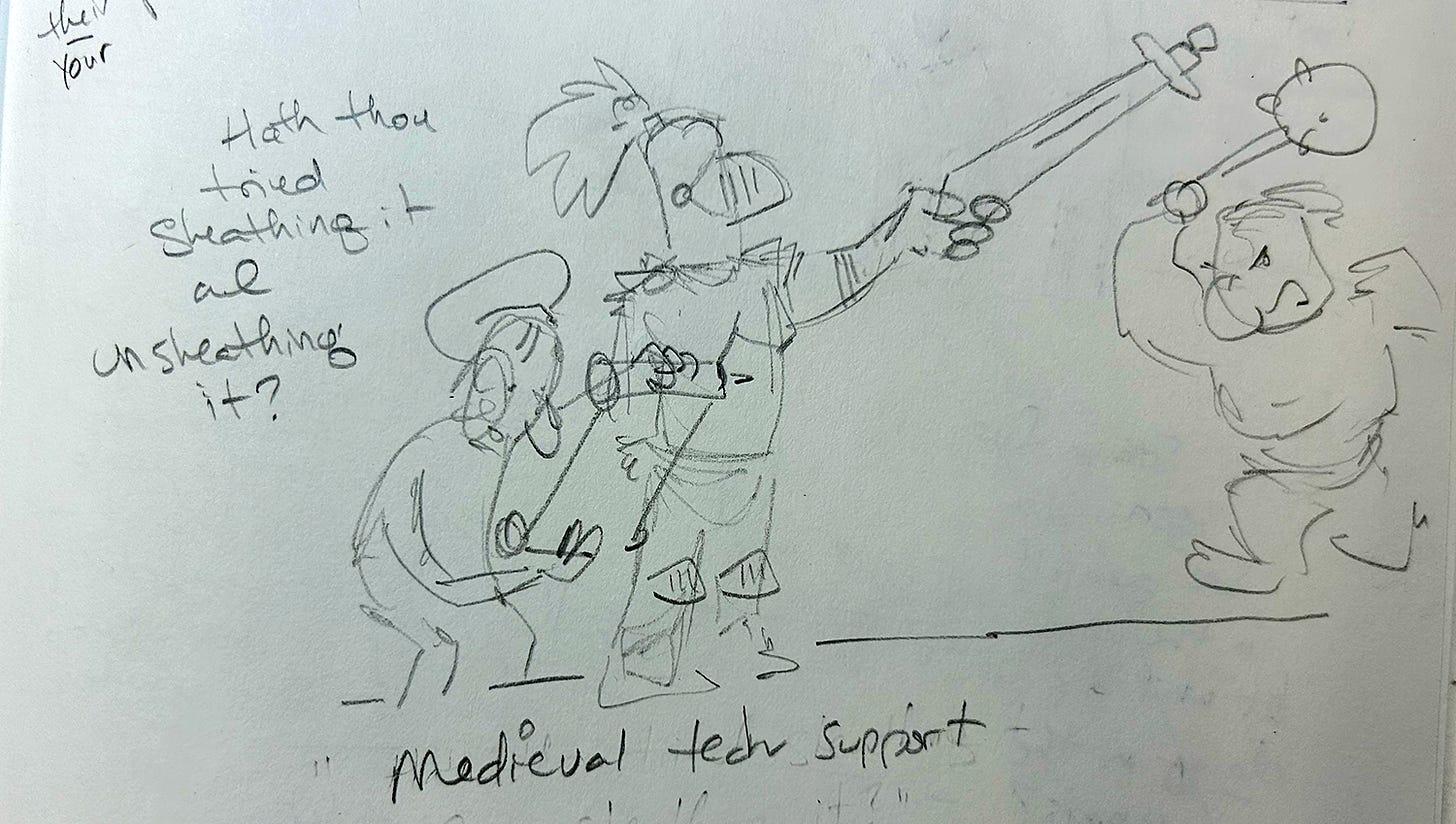 On the left, a medieval fellow reads a scroll: “Hath thou tried sheathing and unsheathing it?” as a knight holds his sword backward against a rushing foe. Caption: Medieval tech support.